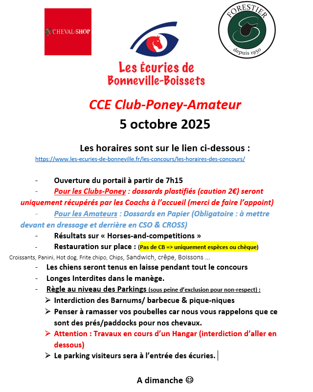• Le portail du centre équestre ouvrira à partir de 7h15